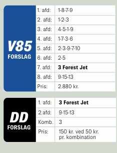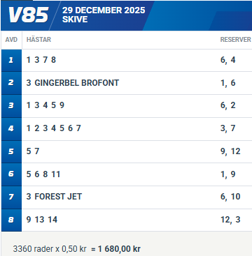 9 Justgivemeareason är nog inte sämre än min tipsetta och även här en häst som jag tror gynnas av den dryga distansen. Han vann senast på Charlottenlund och gjorde det från utvändigt ledaren så han tål dessutom tuffa resor. Han tränar inne på Skivebanan så han har inga problem med utformningen på den och är lika gjuten på en sund V85-lapp som Jackson.