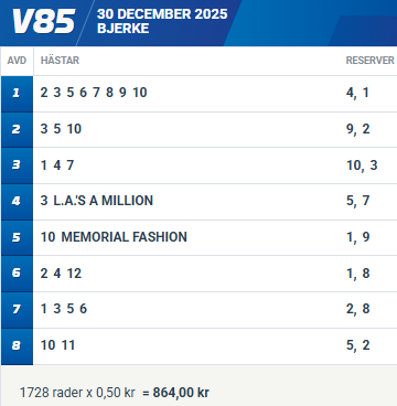 3 L.A.’s A Million är en segervan herre från Norges överlägset vinstrikaste stall, Frode Hamre. Han får ofta tuffa resor men det verkar inte bekomma honom och inför senast hade han två raka vinster i tuffare gäng än han stöter på nu med tuffa resor från spets och dödens. Senast var han åter bra från dödens men kunde inte stå emot några som hade liftat med. Jag tror Frode kör till spets i ett tidigt skede denna gång och bara vinner.