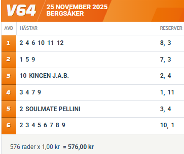 5 GRISLE KONGEN G.L. (V64-6) har utvecklats fint i sin nya regi och sett strålande bra ut. Favoriten är inget att lita på i det här loppet och skulle han göra bort sig är Grisle Kongen G.L ett givet bud.