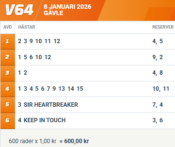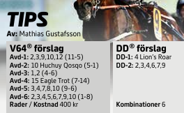 3 CABRILLION C.F. (V64-4) har det inte slagit gnistor om på sistone men den ack så starke sexåringen är väl värd att ta på allvar om man garderar den troligt stora favoriten Dalens Elvis.