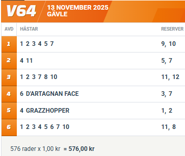 10 VIMO BORKEN (V64-6) var rejäl på en bra segertid senast. Han kommer med fin form och med viss chans att favoriten gör bort sig och de andra tävlar för mycket, kan han komma in i matchen.
