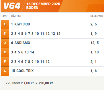 15 COOL TRIX (V64-6) har man åter fått ordentlig stil på och nu senast bollade segermaskinen med sina konkurrenter i en snarlik uppgift. Favorit i repris.
