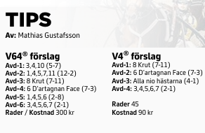 6 D'ARTAGNAN FACE (V64-4) befinner sig i fel klass men den högkapable fyraåringen har inte kommit upp i rätt nivå ännu. Styrkan är enorm och håller han sig bara lugn över tre kilometer ska det var toppchans.