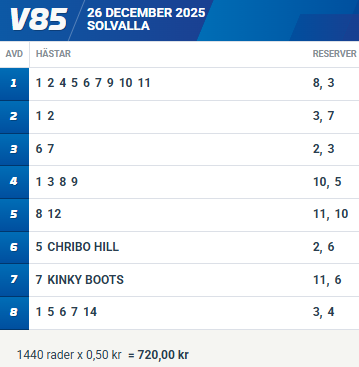 Är en häst jag verkligen gillar och här snackar vi dunderform. Lite svårt utgångsläge men det löser kusken och hästen tål de flesta upplägg.