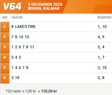 8 LAKE'S FIRE (V64-1) kommer vara bättre än senast och kliver ner flera klasser i motstånd. Till tidig ledning.
