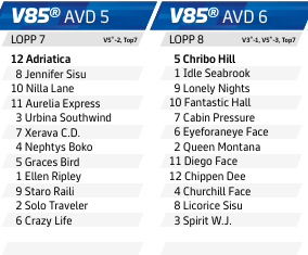 Här finns mitt drag i omgången i form av 8 Jennifer Sisu. Hon gjorde comeback efter frånvaro senast och det på ett riktigt härligt sätt. Tappade fart i sista sväng då man fastnade i en konkurrents vagn, men när det hade löst sig avslutade hon riktigt bra och såg framförallt väldigt fin ut över mål. Hon kan öppna fort, det är en spårtrappa och då är det inte alls dåligt att ha spår åtta med en startsnabb häst. Jag hoppas att kusken laddar iväg, då finns chans på ledningen men bara resan blir hygglig tror jag att hon är väldigt aktuell här. 12 Adriatica ser fin ut och enligt Magnus A Djuse känns hon finare nu än när hon vann svenskt trav-Oaks som treåring. Hon tål jobb, kommer bli favorit och jag låser loppet på Timo Nurmos-hästar. 10 Nilla Lane är en fantastisk häst som vunnit många lopp från ledningen - så även senast. Nu ska hon attackera bakifrån och det blir tuffare då motståndet hårdnar, men ska du ha fler än två hästar ska hon streckas.