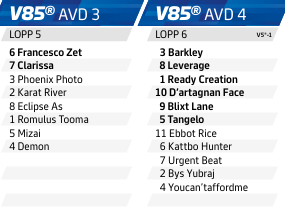 6 Francesco Zet kommer till start med två raka förluster och senast var han rätt så blek och det bet ingenting från kön. Även om han inte kunde utmana Clarissa den dagen borde han varit betydligt närmare i mål än vad han var. Nu har han spår invändigt om värsta konkurrenten och han borde få överta ledningen tidigt i loppet och sedan ska han normalt inte förlora. Dock har han blandat och gett en del och jag litar inte fullt ut på hästen som kommer bli spelad till storfavorit. Vann senast gjorde som sagt 7 Clarissa och det i underbar stil. Underbar var hon även gången innan och denna gång kör Magnus A Djuse. Hade hon haft spetsläge hade jag spikat henne, men nu blir loppet troligen annorlunda kört gentemot senast och Clarissa kommer behöva svara för en smått vansinnig prestation om hon ska besegra Francesco Zet bakifrån eller från utvändig position. Två hästar känns tryggt i ett lopp som är skiktat.