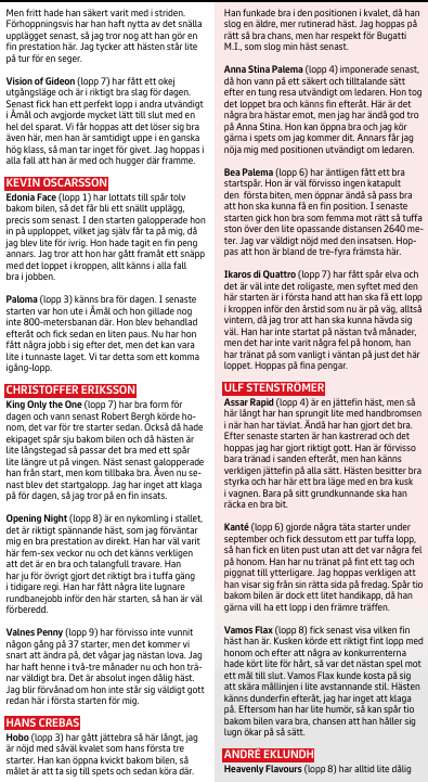 8 Opening Night (V64-5) är en talang utöver det vanliga som visat kunnande som ska kunna ta honom till högsta klassen framöver. Ikväll gör han intressant debut för Christoffer Eriksson och spår åtta i den här spårtrappan skrämmer inte mig – tvärtom då han nu kan köra framåt direkt och krossa allt och alla. Given spik!