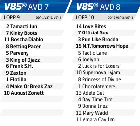 Ett rätt så öppet lopp avslutar omgången. Tipset till 14 Love Bites som var riktigt, riktigt bra senast på Solvalla. Hon fick ett tufft lopp då - men bara tågade på och vann. Nu står hon svårt placerad, men styrkan är hennes främsta vapen och kusken kan köra i god tid om han vill. Är hon lika bra som senast blir hästen tuff att stå emot. 7 Official Sox är en speciell tjej med enorma fartresurser men också en egen vilja som ibland gör att hon springer ”av banan”. Nu har det gått bra ett par lopp och man ser när kusken Carl Johan Jepson kör henne att han verkligen inte vill köra för tidigt med stoet, utan gömma henne så länge det går. Får han till styrningen så är hon oerhört speedig och svårslagen. Det finns ingen i loppet med högre toppfart - det kan jag garantera. 6 Joelynn är stark och långspurtade på ett snyggt sätt senast. Lite vingelrisk från start men kommer man vettigt på det har hon kapacitet för att strida om segern och tränare Andreas Lövdal låter uppåt inför starten.