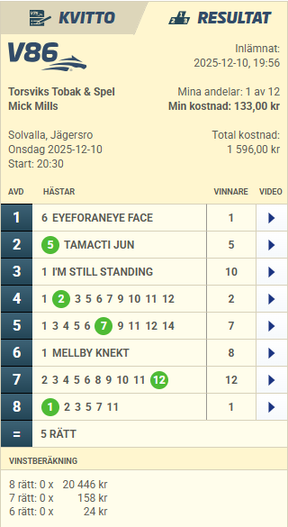 – 12 Vinci Winner (V85-1) har gjort alla sina starter med skor. Han avslutade jättebra som trea i ett V85-lopp på Jägersro och senast blev det enkel seger. Det är optimala förutsättningar och jag räknar vara med i segerstriden. Getingbetyg: 4. Huvudlag: Öppet. Vagn: Finntack.