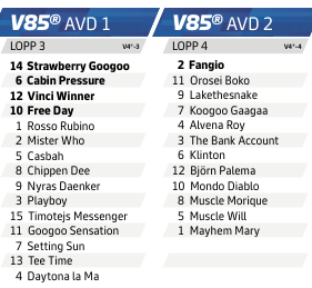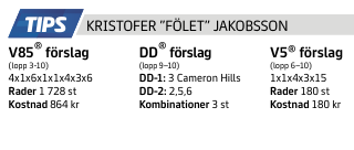 Är lite inne på att den danska hästen 6 Klinton drar det längsta strået i detta lopp då han även förstärks med Örjan Kihlström i sulkyn. 2 Fangio blir favorit i loppet med Robban Bergh, visst är hästen bra, men skor och Bergh känns sådär.