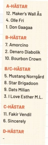 2 CLARISSA (V85-6) Har varit enormt bra och har styrka och inställning som få ston har i världen. Ses med toppchans från perfekt utgångsläge.