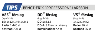 Kvällen avslutas med V5 på Axevalla och dags igen för Ace Wibb (lopp 6). Hästen vann på V85 för bara några dagar sedan, men hade å andra sidan gott om krafter kvar då. Lite andra förutsättningar den här gången, men är snabb i samtliga startmetoder och borde ha respekt med sig.