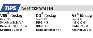 Till lördagens V85-omgång får ni här mina preliminära funderingar i form av ett litet grundsystem på 96 rader – 48 kronor: