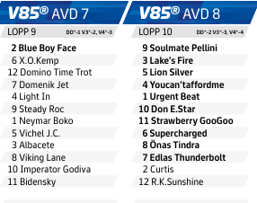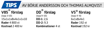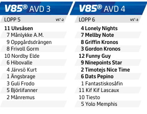 11 Ulvsåsen vann SM tidigare i år och har fortsatt rada upp segrarna. Näst senast vann han utan att se som bäst ut, men senast var det ett bra intryck igen tycker jag. Han är väldigt snabb från start, har ingen häst utvändigt om sig och jag tror att Ulf Ohlsson får en bra start och kommer köra offensivt. Det är stor chans att han tidigt körs till ledningen och sedan är detta en toppchans. Ulvsåsen har tävlat i ledningen 20 gånger med 13 segrar som resultat. 8 Frivoll Gorm är kapabel nog att utmana, men lär tappa mycket på tipsettan från start och det är galopprisk då han blir väldigt ivrig från början. Felfri kan han utmana men det är risk att han förlorar loppet i starten. 7 Månlykke A.M. har inte haft några av sina bästa dagar på sistone och blivit väldigt stum på upploppen. Har han en bra dag, som när han vann på Romme, utmanar han för det är ju en superhäst men det går inte att begära att han ska prestera på topp varje gång numera. Ska eventuellt tävla utan skor och med ett norskt huvudlag, spännande om så blir fallet. 6 Hibovalle tar nog ledningen direkt och sedan släpper man troligen till en felfri Ulvsåsen. Ska du gardera loppet brett är han given - men tilläggshästarna står fint till är känslan.