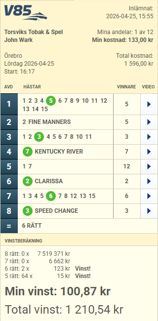 Lördag 25 april V85®® Örebrotravet Första start V85 kl. 16.10 Första start Dagens dubbel kl. 18.25 V85 är kryddat med en superjackpot - 73 miljoner kronor i potten för åtta rätt