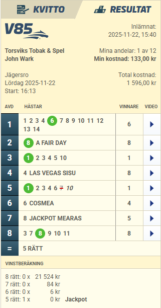 Lördag 22 november V85®® Jägersro Första start V85 kl. 16.10 (obs tiden!) Första start Dagens dubbel kl. 18.25 (obs tiden!) Final av Svensk uppfödninglöpning Dubbeljackpot med 48 miljoner till en ensam vinnare med åtta rätt