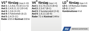 Här kommer stall Djuses bästa chans i omgången enligt mig i form av 1 Handfullofdollar, formen pekar rakt uppåt och luckan bör komma. 3 Mason Pace har stångats i tuffa lopp och duger här.