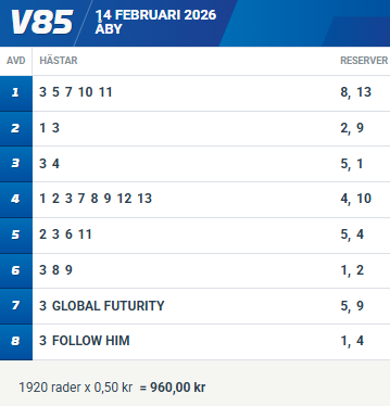 3 Global Futurity satt i spets tidigt trots att han hade bakspår senast. Han vann enkelt och kommer han till ledningen ökar chanserna. Näst senast var han svag från ledningen men resan till Romme satte ned honom.