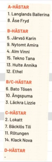 9 Chloe Broline blev ganska trött i spets på Solvalla näst senast så man valde att köra snällt och i rygg senast på Bergsåker och blev då fast med krafter i behåll och det är krafter som man kanske har tillgodo denna gång. Hon är ofta bland de tre första och har en fin startrygg här så inget talar för att hon inte kommer att vara det igen. Med maxklaff kan att vara blande de tre första även vara den som vinner.