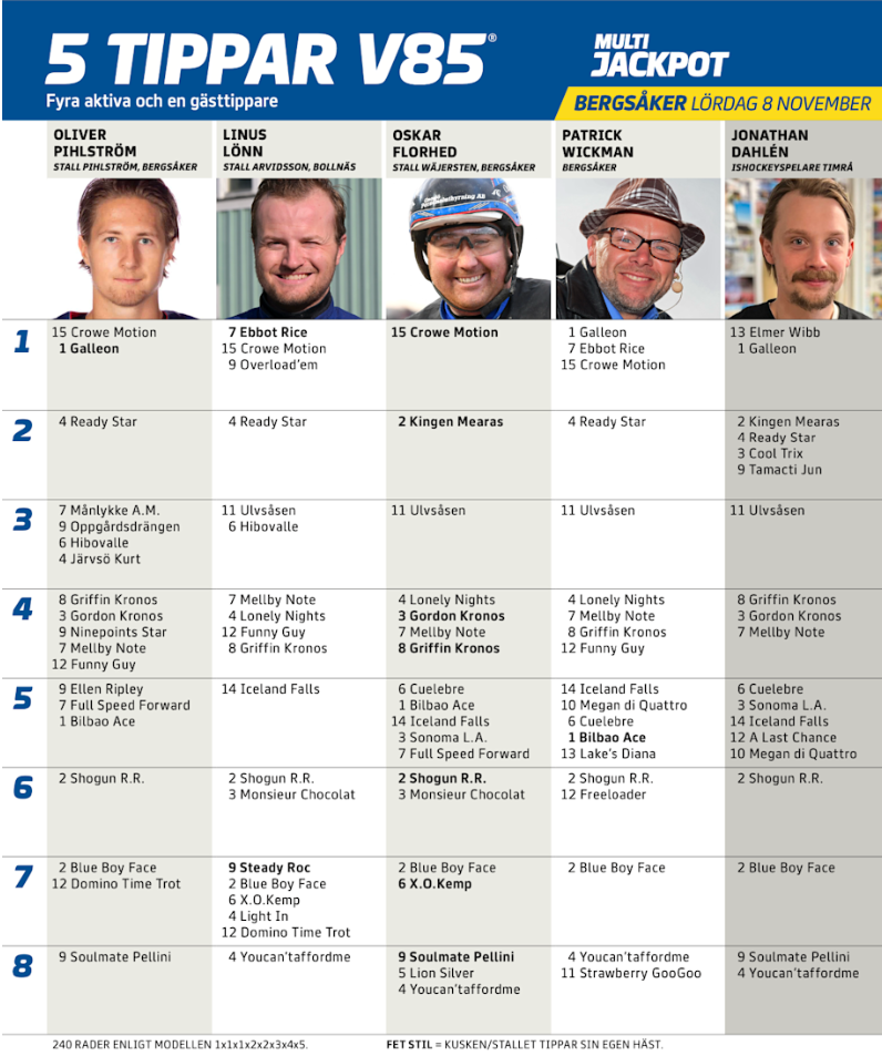15 Crowe Motion har haft en fin säsong hos Daniel Wäjersten och ställs nu inför en väldigt passande uppgift. Normalt sett rundar han det här gänget, för han är van betydligt hårdare sällskap, men han är något ojämn och jag litar inte helt på hästen men solklar förstahäst är han. 1 Galleonär en fin häst som galopperade lite märkligt senast och såg inte tom ut då. Fin och rejäl vid segern gången innan. Tuffaste motstånd han stött på hittills i karriären - men loppet håller som sagt ingen superklass och han är given bakom tipsettan. 7 Ebbot Rice var blek senast men bra gången innan då han besegrade ett gäng rätt så bra hästar. Duger långt här och intressant med Örjan Kihlström vid spakarna. 3 På Toppen fick det inte alls att fungera senast och galopperade dubbelt och såg knepig ut. Bra gången innan och det låter som att Tomas Pettersson är rätt så uppåt kring familjens häst. 9 Overload'em tränar positivt och har rätt så vettig kapacitet. 5 Oliver Schermer är det positiva tongångar kring från stallhåll. Får också plats på lappen.