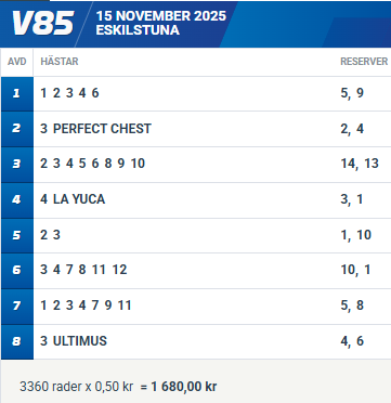 Nåväl avanti, vad händer på lördag? Vi kan se fram emot en sportsligt lysande tävlingsdag med det bästa vi har i Sverige – och då handlar det som bekant om världsklass. Teamet i Eskilstuna (och/eller Svensk Travsport) har toppat tävlingsdagen genom att köra de fyra finalerna tidigt på V85-omgången, detta för att ge utrymme för prisutdelningar och hyllningar av vinnarna. Det brukar Eskilstuna-gänget sköta med bravur!