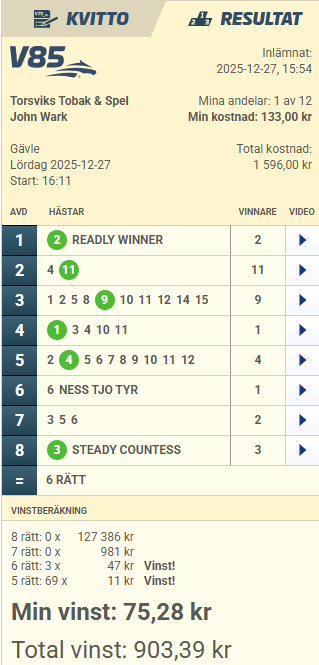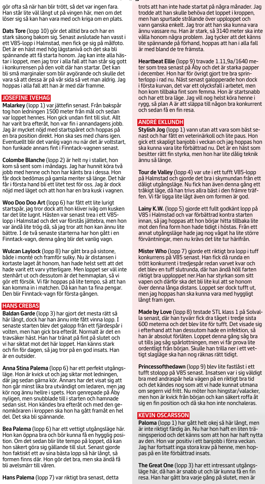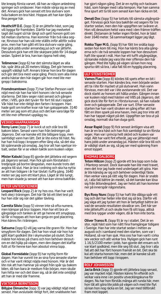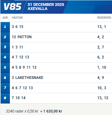 3 LAKETHESNAKE (V85-6) Har varit ute i tuffa sällskap utan att riktigt fått sätta pricken över i:et. Perfekta förutsättningar här och hästen är bra för klassen. God chans.