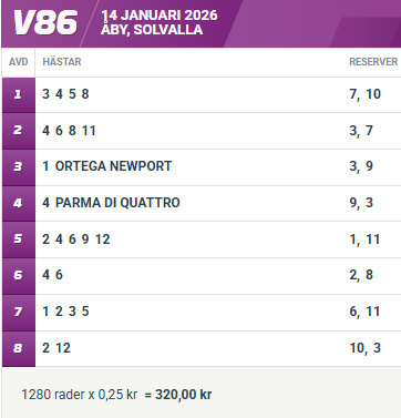 Onsdag 14/1: Tips till V86®® på Åby/Solvalla