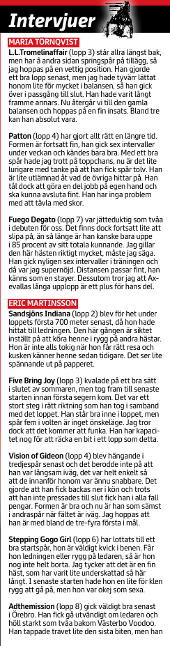 12 Patton har gjort sex starter för Maria Törnqvist och vunnit fyra gånger. Tål att göra jobb, vann med skor runt om näst senast och har tre vinster på sju starter när det som nu varit mer än en månads uppehåll. Högst segerchans.