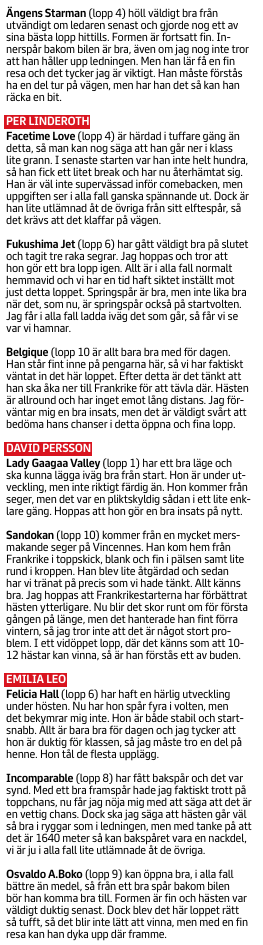 4 Felicia Hall har imponerat med tre raka vinster och visat toppform. Emilia Leo har säkert haft det här loppet på hemmaplan i åtanke när det blir V85-debut för Googoo Gaagaa-dottern. Borde hävda sig väl.