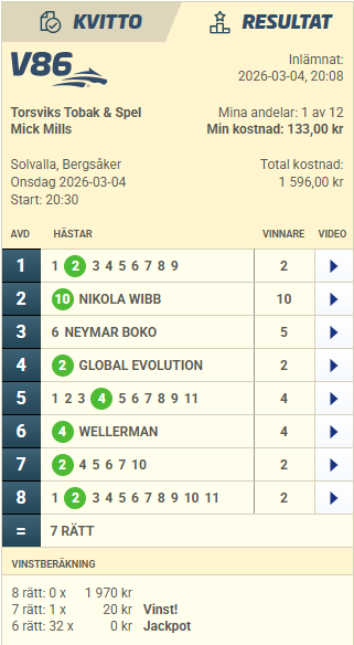 Andelsspel till kvällens V86. Mick Mills är öppnad. 12 andelar för 133 kr/st: